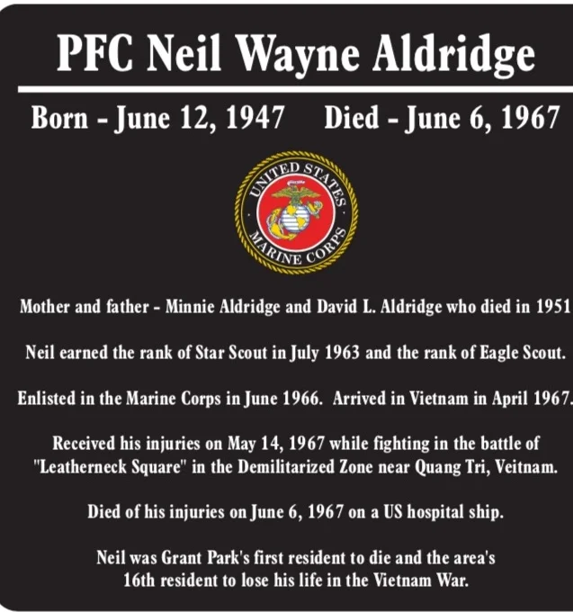 /Join Grant Park and the American Legion at the Community Center as we remember our fallen heroes. Grant Park will honor PFC Neil Wayne Aldridge with a special dedication and bench in his honor.